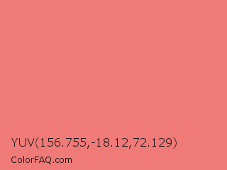 YUV 156.755,-18.12,72.129 Color is a light red color and the nearest color is Light Coral #f08080. Hex code #ef7a78 and RGB value is rgb(239,122,120). In RGB color space, this color is composed of 94% red, 48% green, 47% blue, In CMYK color space, this color is composed of 0% cyan, 49% magenta, 50% yellow , 6% black , In HSL color space, this color has a hue angle of 1° , 79% saturation and 70% lightness.