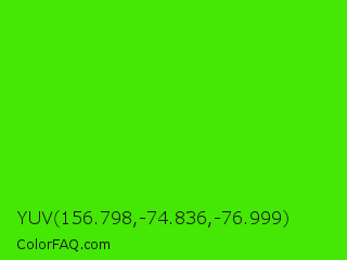 YUV 156.798,-74.836,-76.999 Color is a normal green color and the nearest color is Chlorophyll Green #4aff00. Hex code #45e705 and RGB value is rgb(69,231,5). In RGB color space, this color is composed of 27% red, 91% green, 2% blue, In CMYK color space, this color is composed of 70% cyan, 0% magenta, 98% yellow , 9% black , In HSL color space, this color has a hue angle of 103° , 96% saturation and 46% lightness.