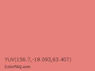 YUV 156.7,-18.093,63.407 Color is a light red color and the nearest color is Light Coral #f08080. Hex code #e57f78 and RGB value is rgb(229,127,120). In RGB color space, this color is composed of 90% red, 50% green, 47% blue, In CMYK color space, this color is composed of 0% cyan, 45% magenta, 48% yellow , 10% black , In HSL color space, this color has a hue angle of 4° , 68% saturation and 68% lightness.