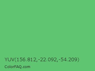 YUV 156.812,-22.092,-54.209 Color is a normal green color and the nearest color is Fern #63b76c. Hex code #5fc570 and RGB value is rgb(95,197,112). In RGB color space, this color is composed of 37% red, 77% green, 44% blue, In CMYK color space, this color is composed of 52% cyan, 0% magenta, 43% yellow , 23% black , In HSL color space, this color has a hue angle of 130° , 47% saturation and 57% lightness.