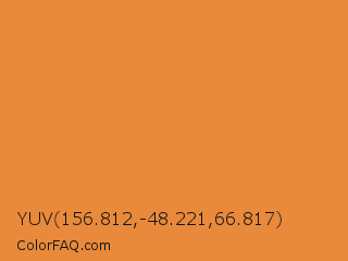 YUV 156.812,-48.221,66.817 Color is a normal orange color and the nearest color is Jaffa #ef863f. Hex code #e9893b and RGB value is rgb(233,137,59). In RGB color space, this color is composed of 91% red, 54% green, 23% blue, In CMYK color space, this color is composed of 0% cyan, 41% magenta, 75% yellow , 9% black , In HSL color space, this color has a hue angle of 27° , 80% saturation and 57% lightness.