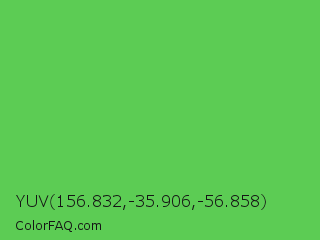 YUV 156.832,-35.906,-56.858 Color is a normal green color and the nearest color is Mantis #74c365. Hex code #5ccc54 and RGB value is rgb(92,204,84). In RGB color space, this color is composed of 36% red, 80% green, 33% blue, In CMYK color space, this color is composed of 55% cyan, 0% magenta, 59% yellow , 20% black , In HSL color space, this color has a hue angle of 116° , 54% saturation and 56% lightness.