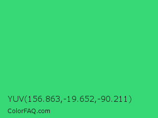 YUV 156.863,-19.652,-90.211 Color is a normal green color and the nearest color is UFO Green #3cd070. Hex code #36d975 and RGB value is rgb(54,217,117). In RGB color space, this color is composed of 21% red, 85% green, 46% blue, In CMYK color space, this color is composed of 75% cyan, 0% magenta, 46% yellow , 15% black , In HSL color space, this color has a hue angle of 143° , 68% saturation and 53% lightness.