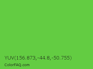 YUV 156.873,-44.8,-50.755 Color is a normal green color and the nearest color is Green RYB #66b032. Hex code #63cc42 and RGB value is rgb(99,204,66). In RGB color space, this color is composed of 39% red, 80% green, 26% blue, In CMYK color space, this color is composed of 51% cyan, 0% magenta, 68% yellow , 20% black , In HSL color space, this color has a hue angle of 106° , 58% saturation and 53% lightness.