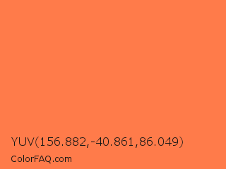 YUV 156.882,-40.861,86.049 Color is a light orange color and the nearest color is Coral #ff7f50. Hex code #ff7b4a and RGB value is rgb(255,123,74). In RGB color space, this color is composed of 100% red, 48% green, 29% blue, In CMYK color space, this color is composed of 0% cyan, 52% magenta, 71% yellow , 0% black , In HSL color space, this color has a hue angle of 16° , 100% saturation and 65% lightness.