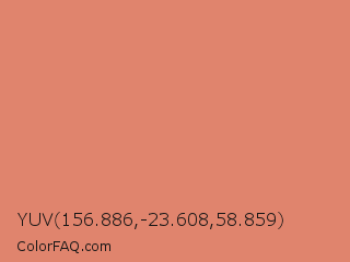 YUV 156.886,-23.608,58.859 Color is a light red color and the nearest color is Copperfield #da8a67. Hex code #e0846d and RGB value is rgb(224,132,109). In RGB color space, this color is composed of 88% red, 52% green, 43% blue, In CMYK color space, this color is composed of 0% cyan, 41% magenta, 51% yellow , 12% black , In HSL color space, this color has a hue angle of 12° , 65% saturation and 65% lightness.