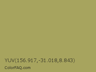 YUV 156.917,-31.018,8.843 Color is a normal yellow color and the nearest color is Husk #b7a458. Hex code #a7a45e and RGB value is rgb(167,164,94). In RGB color space, this color is composed of 65% red, 64% green, 37% blue, In CMYK color space, this color is composed of 0% cyan, 2% magenta, 44% yellow , 35% black , In HSL color space, this color has a hue angle of 58° , 29% saturation and 51% lightness.