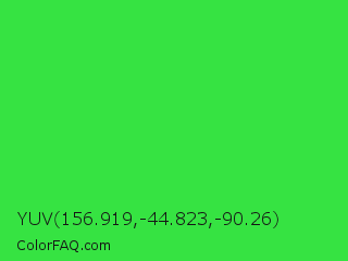 YUV 156.919,-44.823,-90.26 Color is a normal green color and the nearest color is Lime Green #32cd32. Hex code #36e342 and RGB value is rgb(54,227,66). In RGB color space, this color is composed of 21% red, 89% green, 26% blue, In CMYK color space, this color is composed of 76% cyan, 0% magenta, 71% yellow , 11% black , In HSL color space, this color has a hue angle of 124° , 76% saturation and 55% lightness.