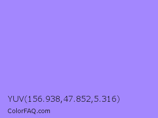 YUV 156.938,47.852,5.316 Color is a light indigo color and the nearest color is Dull Lavender #a899e6. Hex code #a387fe and RGB value is rgb(163,135,254). In RGB color space, this color is composed of 64% red, 53% green, 100% blue, In CMYK color space, this color is composed of 36% cyan, 47% magenta, 0% yellow , 0% black , In HSL color space, this color has a hue angle of 254° , 98% saturation and 76% lightness.