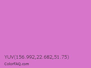 YUV 156.992,22.682,51.75 Color is a light magenta color and the nearest color is French Mauve #d473d4. Hex code #d876cb and RGB value is rgb(216,118,203). In RGB color space, this color is composed of 85% red, 46% green, 80% blue, In CMYK color space, this color is composed of 0% cyan, 45% magenta, 6% yellow , 15% black , In HSL color space, this color has a hue angle of 308° , 56% saturation and 65% lightness.