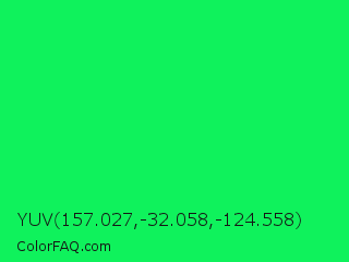 YUV 157.027,-32.058,-124.558 Color is a normal green color and the nearest color is Malachite #0bda51. Hex code #0ff25c and RGB value is rgb(15,242,92). In RGB color space, this color is composed of 6% red, 95% green, 36% blue, In CMYK color space, this color is composed of 94% cyan, 0% magenta, 62% yellow , 5% black , In HSL color space, this color has a hue angle of 140° , 90% saturation and 50% lightness.