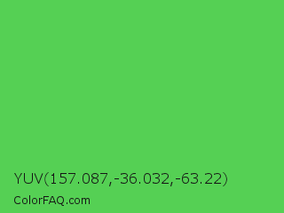 YUV 157.087,-36.032,-63.22 Color is a normal green color and the nearest color is Emerald #50c878. Hex code #55d054 and RGB value is rgb(85,208,84). In RGB color space, this color is composed of 33% red, 82% green, 33% blue, In CMYK color space, this color is composed of 59% cyan, 0% magenta, 60% yellow , 18% black , In HSL color space, this color has a hue angle of 120° , 57% saturation and 57% lightness.