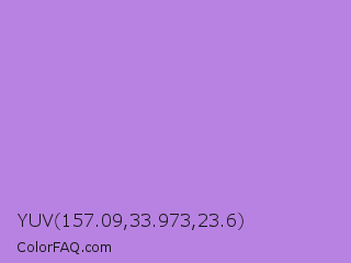 YUV 157.09,33.973,23.6 Color is a light purple color and the nearest color is Lavender #b57edc. Hex code #b882e2 and RGB value is rgb(184,130,226). In RGB color space, this color is composed of 72% red, 51% green, 89% blue, In CMYK color space, this color is composed of 19% cyan, 42% magenta, 0% yellow , 11% black , In HSL color space, this color has a hue angle of 274° , 62% saturation and 70% lightness.