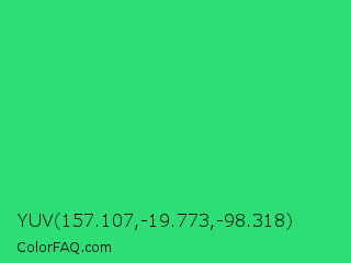 YUV 157.107,-19.773,-98.318 Color is a normal green color and the nearest color is UFO Green #3cd070. Hex code #2dde75 and RGB value is rgb(45,222,117). In RGB color space, this color is composed of 18% red, 87% green, 46% blue, In CMYK color space, this color is composed of 80% cyan, 0% magenta, 47% yellow , 13% black , In HSL color space, this color has a hue angle of 144° , 73% saturation and 52% lightness.