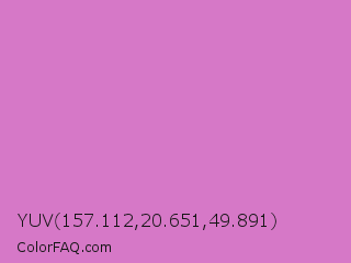 YUV 157.112,20.651,49.891 Color is a light magenta color and the nearest color is French Mauve #d473d4. Hex code #d678c7 and RGB value is rgb(214,120,199). In RGB color space, this color is composed of 84% red, 47% green, 78% blue, In CMYK color space, this color is composed of 0% cyan, 44% magenta, 7% yellow , 16% black , In HSL color space, this color has a hue angle of 310° , 53% saturation and 65% lightness.