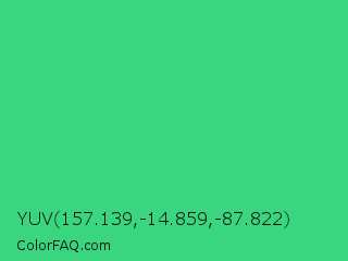 YUV 157.139,-14.859,-87.822 Color is a normal green color and the nearest color is UFO Green #3cd070. Hex code #39d67f and RGB value is rgb(57,214,127). In RGB color space, this color is composed of 22% red, 84% green, 50% blue, In CMYK color space, this color is composed of 73% cyan, 0% magenta, 41% yellow , 16% black , In HSL color space, this color has a hue angle of 147° , 66% saturation and 53% lightness.