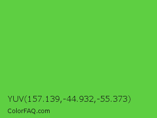YUV 157.139,-44.932,-55.373 Color is a normal green color and the nearest color is Green RYB #66b032. Hex code #5ecf42 and RGB value is rgb(94,207,66). In RGB color space, this color is composed of 37% red, 81% green, 26% blue, In CMYK color space, this color is composed of 55% cyan, 0% magenta, 68% yellow , 19% black , In HSL color space, this color has a hue angle of 108° , 59% saturation and 54% lightness.