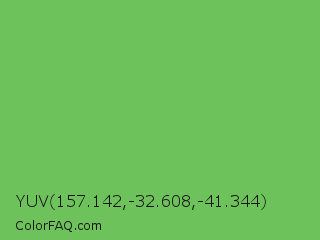 YUV 157.142,-32.608,-41.344 Color is a normal green color and the nearest color is Mantis #74c365. Hex code #6ec25b and RGB value is rgb(110,194,91). In RGB color space, this color is composed of 43% red, 76% green, 36% blue, In CMYK color space, this color is composed of 43% cyan, 0% magenta, 53% yellow , 24% black , In HSL color space, this color has a hue angle of 109° , 46% saturation and 56% lightness.