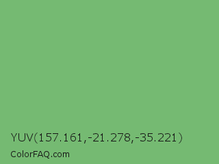 YUV 157.161,-21.278,-35.221 Color is a normal green color and the nearest color is Iguana Green #71bc78. Hex code #75ba72 and RGB value is rgb(117,186,114). In RGB color space, this color is composed of 46% red, 73% green, 45% blue, In CMYK color space, this color is composed of 37% cyan, 0% magenta, 39% yellow , 27% black , In HSL color space, this color has a hue angle of 118° , 34% saturation and 59% lightness.