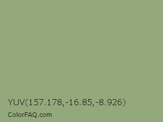 YUV 157.178,-16.85,-8.926 Color is a normal green color and the nearest color is Sage #9ea587. Hex code #93a97b and RGB value is rgb(147,169,123). In RGB color space, this color is composed of 58% red, 66% green, 48% blue, In CMYK color space, this color is composed of 13% cyan, 0% magenta, 27% yellow , 34% black , In HSL color space, this color has a hue angle of 89° , 21% saturation and 57% lightness.