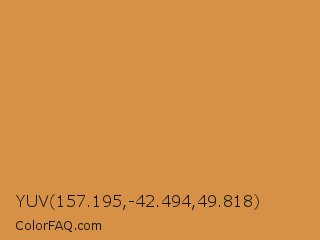 YUV 157.195,-42.494,49.818 Color is a normal orange color and the nearest color is Tigers Eye #e08d3c. Hex code #d69147 and RGB value is rgb(214,145,71). In RGB color space, this color is composed of 84% red, 57% green, 28% blue, In CMYK color space, this color is composed of 0% cyan, 32% magenta, 67% yellow , 16% black , In HSL color space, this color has a hue angle of 31° , 64% saturation and 56% lightness.
