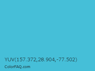 YUV 157.372,28.904,-77.502 Color is a normal cyan color and the nearest color is Sea Serpent #4bc7cf. Hex code #45bfd8 and RGB value is rgb(69,191,216). In RGB color space, this color is composed of 27% red, 75% green, 85% blue, In CMYK color space, this color is composed of 68% cyan, 12% magenta, 0% yellow , 15% black , In HSL color space, this color has a hue angle of 190° , 65% saturation and 56% lightness.