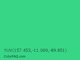 YUV 157.453,-11.069,-89.851 Color is a normal green color and the nearest color is Shamrock #33cc99. Hex code #37d687 and RGB value is rgb(55,214,135). In RGB color space, this color is composed of 22% red, 84% green, 53% blue, In CMYK color space, this color is composed of 74% cyan, 0% magenta, 37% yellow , 16% black , In HSL color space, this color has a hue angle of 150° , 66% saturation and 53% lightness.