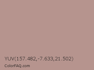 YUV 157.482,-7.633,21.502 Color is a light red color and the nearest color is Quicksand #bd978e. Hex code #b6948e and RGB value is rgb(182,148,142). In RGB color space, this color is composed of 71% red, 58% green, 56% blue, In CMYK color space, this color is composed of 0% cyan, 19% magenta, 22% yellow , 29% black , In HSL color space, this color has a hue angle of 9° , 22% saturation and 64% lightness.