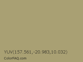 YUV 157.561,-20.983,10.032 Color is a normal yellow color and the nearest color is Donkey Brown #a69279. Hex code #a9a073 and RGB value is rgb(169,160,115). In RGB color space, this color is composed of 66% red, 63% green, 45% blue, In CMYK color space, this color is composed of 0% cyan, 5% magenta, 32% yellow , 34% black , In HSL color space, this color has a hue angle of 50° , 24% saturation and 56% lightness.