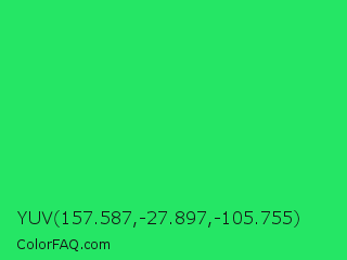 YUV 157.587,-27.897,-105.755 Color is a normal green color and the nearest color is UFO Green #3cd070. Hex code #25e665 and RGB value is rgb(37,230,101). In RGB color space, this color is composed of 15% red, 90% green, 40% blue, In CMYK color space, this color is composed of 84% cyan, 0% magenta, 56% yellow , 10% black , In HSL color space, this color has a hue angle of 140° , 79% saturation and 52% lightness.