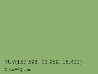 YUV 157.598,-23.959,-15.433 Color is a normal green color and the nearest color is Asparagus #87a96b. Hex code #8cb06d and RGB value is rgb(140,176,109). In RGB color space, this color is composed of 55% red, 69% green, 43% blue, In CMYK color space, this color is composed of 20% cyan, 0% magenta, 38% yellow , 31% black , In HSL color space, this color has a hue angle of 92° , 30% saturation and 56% lightness.