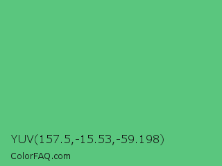 YUV 157.5,-15.53,-59.198 Color is a normal green color and the nearest color is Emerald #50c878. Hex code #5ac67e and RGB value is rgb(90,198,126). In RGB color space, this color is composed of 35% red, 78% green, 49% blue, In CMYK color space, this color is composed of 55% cyan, 0% magenta, 36% yellow , 22% black , In HSL color space, this color has a hue angle of 140° , 49% saturation and 56% lightness.