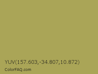 YUV 157.603,-34.807,10.872 Color is a normal yellow color and the nearest color is Husk #b7a458. Hex code #aaa557 and RGB value is rgb(170,165,87). In RGB color space, this color is composed of 67% red, 65% green, 34% blue, In CMYK color space, this color is composed of 0% cyan, 3% magenta, 49% yellow , 33% black , In HSL color space, this color has a hue angle of 56° , 33% saturation and 50% lightness.