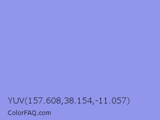 YUV 157.608,38.154,-11.057 Color is a light blue color and the nearest color is Portage #8b9fee. Hex code #9195eb and RGB value is rgb(145,149,235). In RGB color space, this color is composed of 57% red, 58% green, 92% blue, In CMYK color space, this color is composed of 38% cyan, 37% magenta, 0% yellow , 8% black , In HSL color space, this color has a hue angle of 237° , 69% saturation and 75% lightness.