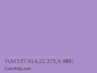 YUV 157.614,22.375,9.986 Color is a light violet color and the nearest color is East Side #ac91ce. Hex code #a98fcb and RGB value is rgb(169,143,203). In RGB color space, this color is composed of 66% red, 56% green, 80% blue, In CMYK color space, this color is composed of 17% cyan, 30% magenta, 0% yellow , 20% black , In HSL color space, this color has a hue angle of 266° , 37% saturation and 68% lightness.