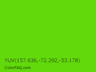 YUV 157.636,-72.292,-53.178 Color is a normal green color and the nearest color is Harlequin Green #46cb18. Hex code #61d90b and RGB value is rgb(97,217,11). In RGB color space, this color is composed of 38% red, 85% green, 4% blue, In CMYK color space, this color is composed of 55% cyan, 0% magenta, 95% yellow , 15% black , In HSL color space, this color has a hue angle of 95° , 90% saturation and 45% lightness.