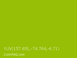 YUV 157.651,-74.764,-6.71 Color is a normal lime color and the nearest color is Pistachio Green #9dc209. Hex code #96bf06 and RGB value is rgb(150,191,6). In RGB color space, this color is composed of 59% red, 75% green, 2% blue, In CMYK color space, this color is composed of 21% cyan, 0% magenta, 97% yellow , 25% black , In HSL color space, this color has a hue angle of 73° , 94% saturation and 39% lightness.