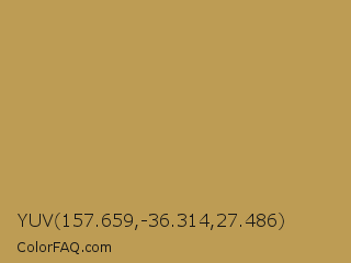 YUV 157.659,-36.314,27.486 Color is a normal orange color and the nearest color is Aztec Gold #c39953. Hex code #bd9c54 and RGB value is rgb(189,156,84). In RGB color space, this color is composed of 74% red, 61% green, 33% blue, In CMYK color space, this color is composed of 0% cyan, 17% magenta, 56% yellow , 26% black , In HSL color space, this color has a hue angle of 41° , 44% saturation and 54% lightness.