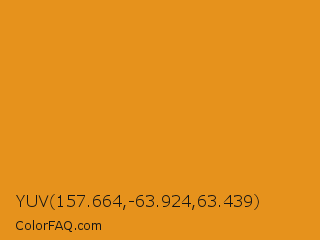 YUV 157.664,-63.924,63.439 Color is a normal orange color and the nearest color is Dixie #e29418. Hex code #e6921c and RGB value is rgb(230,146,28). In RGB color space, this color is composed of 90% red, 57% green, 11% blue, In CMYK color space, this color is composed of 0% cyan, 37% magenta, 88% yellow , 10% black , In HSL color space, this color has a hue angle of 35° , 80% saturation and 51% lightness.