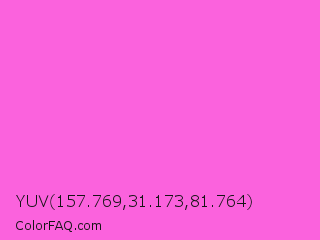 YUV 157.769,31.173,81.764 Color is a light magenta color and the nearest color is Light Deep Pink #ff5ccd. Hex code #fb62dd and RGB value is rgb(251,98,221). In RGB color space, this color is composed of 98% red, 38% green, 87% blue, In CMYK color space, this color is composed of 0% cyan, 61% magenta, 12% yellow , 2% black , In HSL color space, this color has a hue angle of 312° , 95% saturation and 68% lightness.