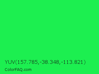 YUV 157.785,-38.348,-113.821 Color is a normal green color and the nearest color is Malachite #0bda51. Hex code #1cef50 and RGB value is rgb(28,239,80). In RGB color space, this color is composed of 11% red, 94% green, 31% blue, In CMYK color space, this color is composed of 88% cyan, 0% magenta, 67% yellow , 6% black , In HSL color space, this color has a hue angle of 135° , 87% saturation and 52% lightness.