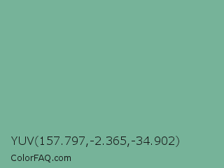 YUV 157.797,-2.365,-34.902 Color is a normal green color and the nearest color is Acapulco #7cb0a1. Hex code #76b399 and RGB value is rgb(118,179,153). In RGB color space, this color is composed of 46% red, 70% green, 60% blue, In CMYK color space, this color is composed of 34% cyan, 0% magenta, 15% yellow , 30% black , In HSL color space, this color has a hue angle of 154° , 29% saturation and 58% lightness.