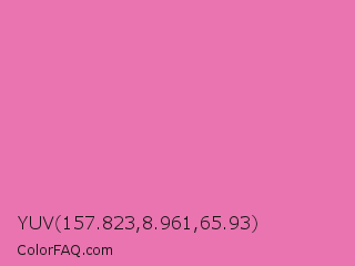 YUV 157.823,8.961,65.93 Color is a light rose color and the nearest color is Thulian Pink #de6fa1. Hex code #e974b0 and RGB value is rgb(233,116,176). In RGB color space, this color is composed of 91% red, 45% green, 69% blue, In CMYK color space, this color is composed of 0% cyan, 50% magenta, 24% yellow , 9% black , In HSL color space, this color has a hue angle of 329° , 73% saturation and 68% lightness.