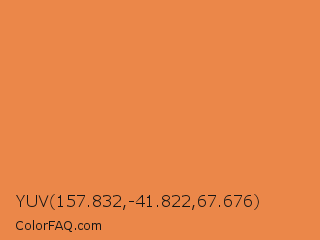 YUV 157.832,-41.822,67.676 Color is a normal orange color and the nearest color is Jaffa #ef863f. Hex code #eb8749 and RGB value is rgb(235,135,73). In RGB color space, this color is composed of 92% red, 53% green, 29% blue, In CMYK color space, this color is composed of 0% cyan, 43% magenta, 69% yellow , 8% black , In HSL color space, this color has a hue angle of 23° , 80% saturation and 60% lightness.