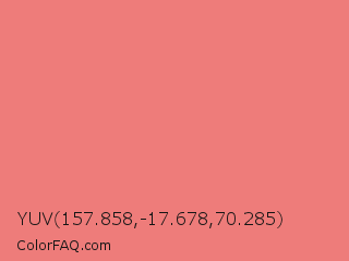 YUV 157.858,-17.678,70.285 Color is a light red color and the nearest color is Light Coral #f08080. Hex code #ee7c7a and RGB value is rgb(238,124,122). In RGB color space, this color is composed of 93% red, 49% green, 48% blue, In CMYK color space, this color is composed of 0% cyan, 48% magenta, 49% yellow , 7% black , In HSL color space, this color has a hue angle of 1° , 77% saturation and 71% lightness.