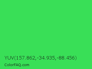 YUV 157.862,-34.935,-88.456 Color is a normal green color and the nearest color is UFO Green #3cd070. Hex code #39df57 and RGB value is rgb(57,223,87). In RGB color space, this color is composed of 22% red, 87% green, 34% blue, In CMYK color space, this color is composed of 74% cyan, 0% magenta, 61% yellow , 13% black , In HSL color space, this color has a hue angle of 131° , 72% saturation and 55% lightness.