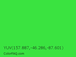 YUV 157.887,-46.286,-87.601 Color is a normal green color and the nearest color is Lime Green #32cd32. Hex code #3ae340 and RGB value is rgb(58,227,64). In RGB color space, this color is composed of 23% red, 89% green, 25% blue, In CMYK color space, this color is composed of 74% cyan, 0% magenta, 72% yellow , 11% black , In HSL color space, this color has a hue angle of 122° , 75% saturation and 56% lightness.