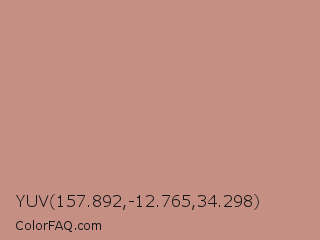 YUV 157.892,-12.765,34.298 Color is a light red color and the nearest color is Brandy Rose #bb8983. Hex code #c58f84 and RGB value is rgb(197,143,132). In RGB color space, this color is composed of 77% red, 56% green, 52% blue, In CMYK color space, this color is composed of 0% cyan, 27% magenta, 33% yellow , 23% black , In HSL color space, this color has a hue angle of 10° , 36% saturation and 65% lightness.