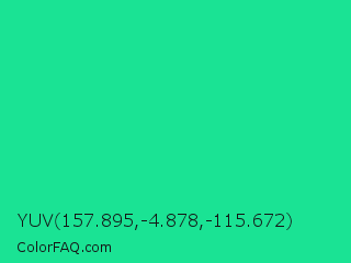 YUV 157.895,-4.878,-115.672 Color is a normal green color and the nearest color is Shamrock #33cc99. Hex code #1ae394 and RGB value is rgb(26,227,148). In RGB color space, this color is composed of 10% red, 89% green, 58% blue, In CMYK color space, this color is composed of 89% cyan, 0% magenta, 35% yellow , 11% black , In HSL color space, this color has a hue angle of 156° , 79% saturation and 50% lightness.