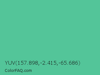 YUV 157.898,-2.415,-65.686 Color is a normal green color and the nearest color is Ocean Green #48bf91. Hex code #53c599 and RGB value is rgb(83,197,153). In RGB color space, this color is composed of 33% red, 77% green, 60% blue, In CMYK color space, this color is composed of 58% cyan, 0% magenta, 22% yellow , 23% black , In HSL color space, this color has a hue angle of 157° , 50% saturation and 55% lightness.